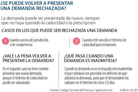 Cuando una demanda es rechazada, según el artículo 90 del Código General del Proceso, pueden pasar dos sucesos. El primero hace referencia a que el juez podrá rechazar esa demanda cuando carezca de jurisdicción o cuando esté vencido el término para instaurarla. En el segundo escenario, no se debe presentar una nueva demanda puesto que el término de la caducidad no puede ser subsanado, así que en tal caso de presentarla en una segunda ocasión, esta será nuevamente rechazada.