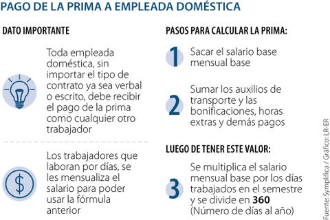 Luego de tener este valor se realiza la siguiente operación: salario mensual base por los días trabajados en el semestre, divididos por el número de días en el año (360). De esta manera se sabrá cuando se le debe pagar de prima a las empleadas domésticas.