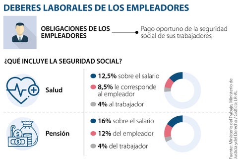 Por otro lado, el artículo 17 de la ley 100 de 1993 establece la obligatoriedad de las cotizaciones por parte de la empresa a la seguridad social de los trabajadores; (que incluye aportes en salud, riesgos laborales y pensión). Según lo enunciado por el Ministerio de Justicia, las empresas deben aportar al pago de pensión en salud en promedio de 12,5% sobre el salario, de los cuales le corresponde al empleador 8,5% y al trabajador el 4%.