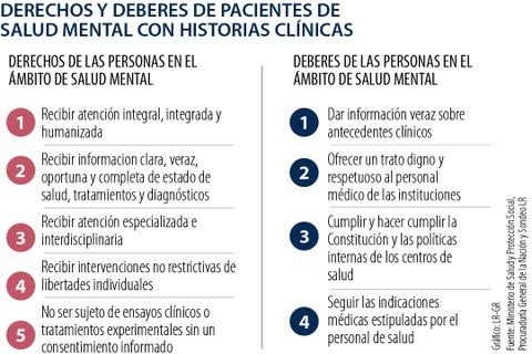 Con respecto a los derechos de los pacientes de salud mental en relación a sus historias clínicas, se destacan el derecho a conocer y solicitar su registro médico, acceder a un control médico adecuado y documentado por medio de ellas; otros derechos de estos pacientes son no ser sujetos de ensayos clínicos o tratamientos experimentales sin un consentimiento informado y no recibir intervenciones que restrinjan libertades individuales.